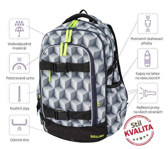 Školní batoh vhodný od 3. třídy Kvalitní, ergonomicky tvarovaný, odlehčený školní batoh s anatomicky tvarovanými zády. Batoh je vhodný pro dítě s výškou 130 - 145 cm. Školní batohy Stil jsou certifikovány a ověřeny lékaři.