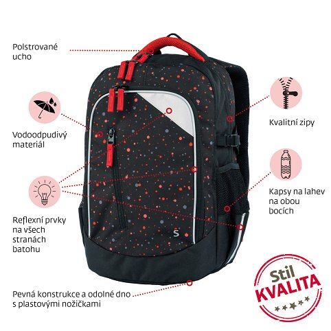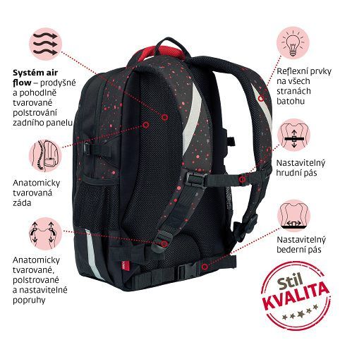 Kvalitní anatomicky tvarovaný batoh vhodný od 3. třídy, systém Air Flow a prodyšné polstrování,2komory na formát A4 a 3 vnitřní přihrádky,kapsa na notebook,vodoodpudivý materiál,zpevněné nepromokavé dno,reflexní prvky,hrudní pás.