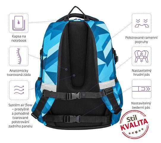 Školní batoh vhodný od 3. třídy Kvalitní, ergonomicky tvarovaný, odlehčený školní batoh s anatomicky tvarovanými zády. Batoh je vhodný pro dítě s výškou 130 - 145 cm.