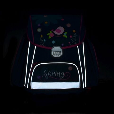 Školní aktovka z řady Premium s motivem spring je anatomicky tvarovaná a zajišťuje tak správné usazení na zádech. Vyztužená záda a vnitřní výztuha udržují stálý tvar batohu. Polstrování je z příjemného prodyšného materiálu, široké měkčené popruhy jsou navrženy tak, aby dokonale přilnuly a rovnoměrně zatížily ramena dítěte. Aktovka se skládá z jedné prostorné komory, kam se pohodlně vejdou všechny školní pomůcky pro děti v 1. a ve 2. třídě. Dno batohu je z pevného materiálu, chrání tím obsah před převržením a vysypáním. Zapínání je na bezpečnostní přezku. Přední kapsička je určena na svačinu, nechybí řada reflexních prvků, díky kterým je aktovka viditelnější.