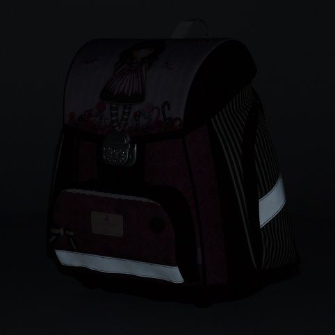 Školní aktovka z řady Premium s motivem Santoro Sugar And Spice je anatomicky tvarovaná a zajišťuje tak správné usazení na zádech. Vyztužená záda a vnitřní výztuha udržují stálý tvar batohu. Polstrování je z příjemného prodyšného materiálu, široké měkčené popruhy jsou navrženy tak, aby dokonale přilnuly a rovnoměrně zatížily ramena dítěte. Aktovka se skládá z jedné prostorné komory, kam se pohodlně vejdou všechny školní pomůcky pro děti v 1. a ve 2. třídě. Dno batohu je z pevného materiálu, chrání tím obsah před převržením a vysypáním. Zapínání je na bezpečnostní přezku. Přední kapsička je určena na svačinu, nechybí řada reflexních prvků, díky kterým je aktovka viditelnější.