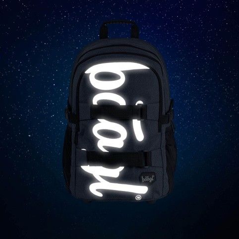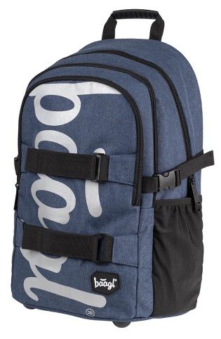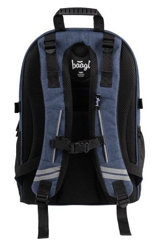 Školní batoh Skate Blue s reflexním logem Baagl na přední straně, vhodný od 3. třídy 1. stupně ZŠ a také pro 2. stupeň ZŠ. Batoh byl úspěšně testován v ITC Zlín.