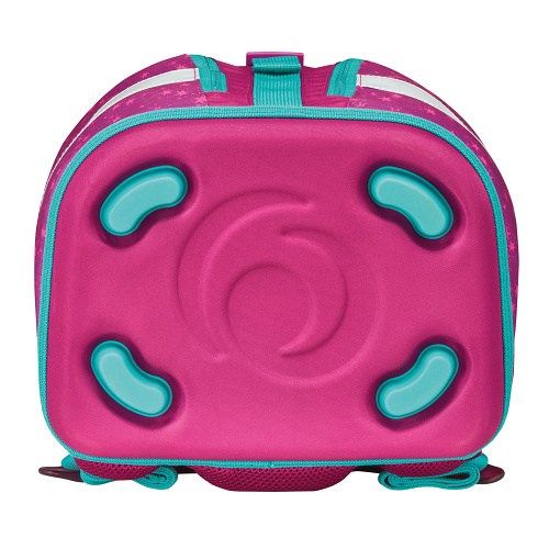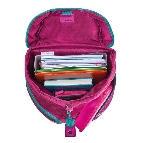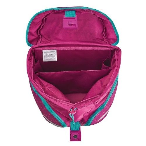 38x28x23 cm. Ergonomicky tvarované a prodyšné zadní polstrování, Duální nastavitelné ramenní popruhy, výškově nastavitelný hrudní pás, Reflexní materiál Oralite, Magnetický uzávěr FidLock, Impregnace odpuzující vodu, Stabilní deska s plastovými nožičkami, 2 výměnné motivy se suchým zipem, Rukojeť. 1 prostorná vnitřní přihrádka s odděleným prostorem pro knihy, 2 boční kapsy se zapínáním na zip.