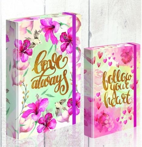 Velmi pevný box na školní sešity, k uzavírání slouží barevná gumička, vysoká kvalita, potisk s odleskem, velikost 330x240x42 mm