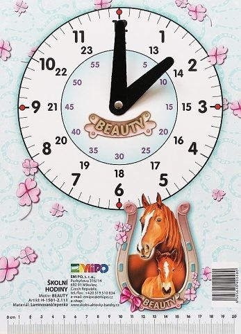 Školní hodiny slouží k výuce času prvňáčkům základních škol. Ve spodní části hodin je pravítko, které se může odstřihnout a používat samostatně.