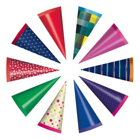 Školní kornout 15 cm, kulatý, uzavíratelný krepovým papírem, 10 motivů - červený, modrý, růžový, zelený, modrý s pruhy, modrý káro, fialový s tečkami, žlutý s tečkami, červený se srdíčky, zelený s hvězdami