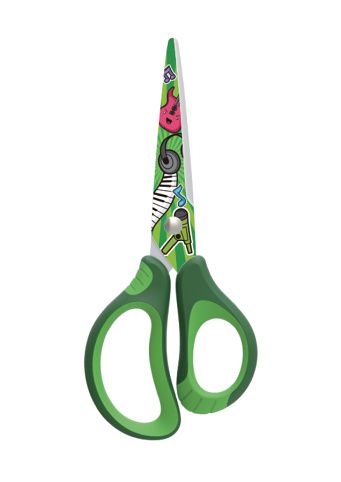 Školní nůžky s potiskem a s kulatou špičkou 15cm. Ergonomická a měkká rukojeť pro snadnější držení. Kvalitní ocelové nože. Moderní "tattoo" design. Dodáváno na blistru v mixu 3 barev.