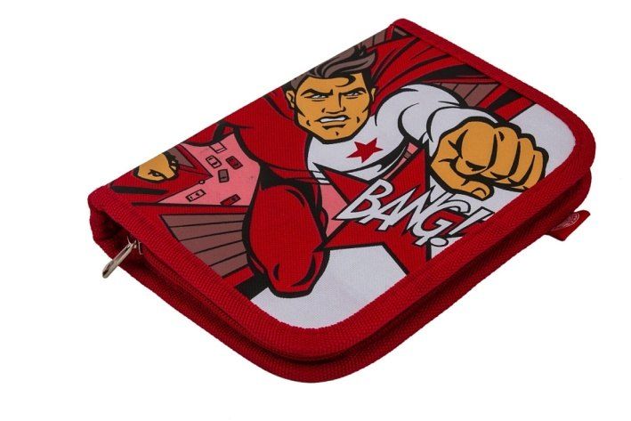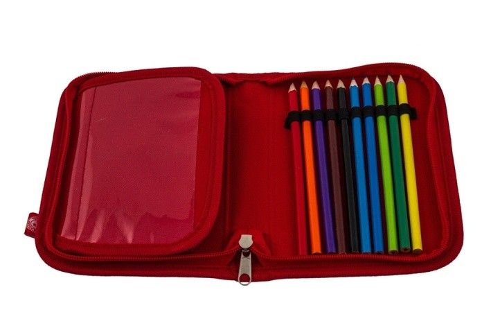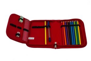 Materiál: 100% polyester. Rozměry: 13,5 x 19,5 x 3,5 cm. Balení: jednotlivě v PP sáčku, hromadně v kartonu po 100 ks. • Dětský školní jednopatrový penál s chlopní, který je naplněn pastelkami, fixy, pravítkem, ořezávátkem a gumou. • Na klopě je průhledná kapsa vhodná pro umístění školního rozvrhu