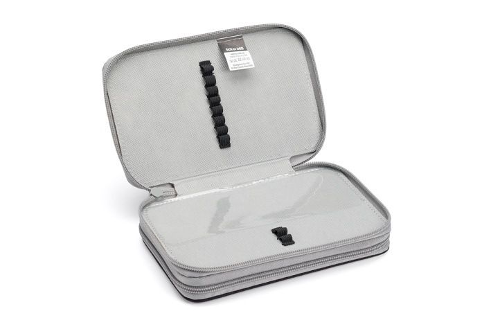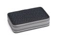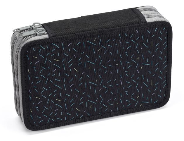 Dvoupatrový penál do školy má v jedné části 8 gumiček na pastelky, 2 gumičky na tužky a jednu větší na pero. Obsahuje i gumičky na gumu a ořezávátko, dále malou kapsičku na drobnosti, která je uzavíratelná na patent.Druhá část penálu má průhlednou kapsičku na rozvrh a tajné dokumenty, dále 9 pevných gumiček na psací potřeby různých velikostí.