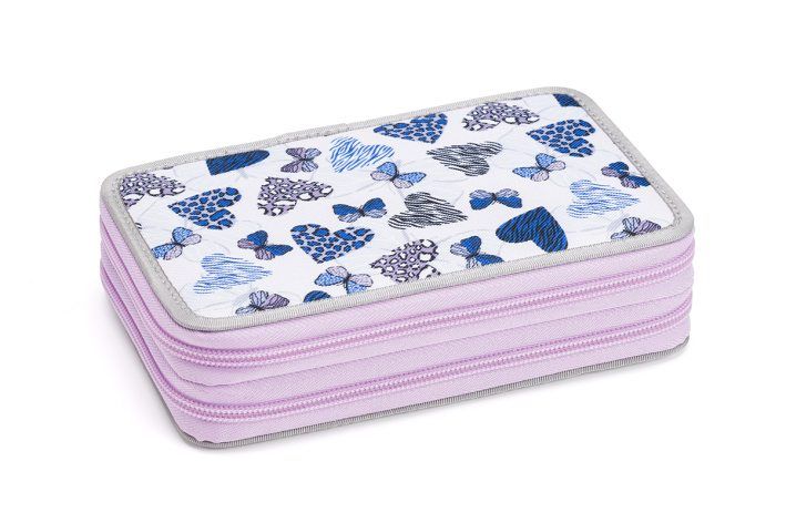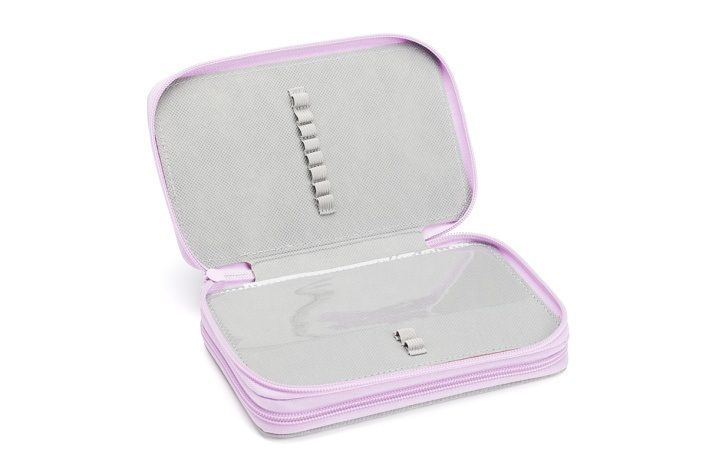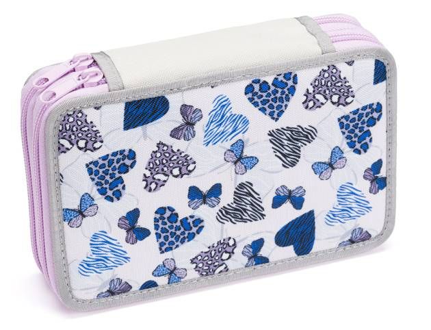 Dvoupatrový penál do školy má v jedné části 8 gumiček na pastelky, 2 gumičky na tužky a jednu větší na pero. Obsahuje i gumičky na gumu a ořezávátko, dále malou kapsičku na drobnosti, která je uzavíratelná na patent.Druhá část penálu má průhlednou kapsičku na rozvrh a tajné dokumenty, dále 9 pevných gumiček na psací potřeby různých velikostí.
