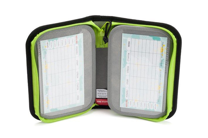 Jednopatrové penály mají velkou kapacitu k umístění psacích potřeb. 23 pevných gumiček různých velikostí k pohodlnému uložení větších pastelek nebo psacího pera, pravítka, ořezávátka a gumy. Vnitřní dvě chlopně mají na vnější straně průhlednou kapsičku na rozvrh či jiné malé dokumenty. Na vnitřní straně je kapsička na drobnosti, uzavíratelná patentem. Novinka: zipy jednopatrových penálů jsme letos vylepšili šňůrkou na jezdci zipu, který usnadní dětským prstům otevírání a zavírání penálu. Dokonale barevně sladěný design s aktovkou či batohem je samozřejmostí.