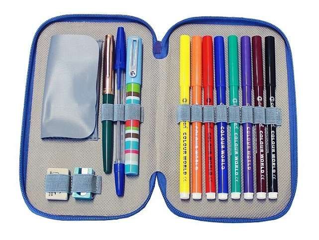 Třípatrový penál EMIPO má celkem 29 pruženkových poutek pro různé druhy psacích a kreslících potřeb, rozdělených do třech samostatných oddělení umístěných nad sebou a uzavíraných na zip. Na školní lavici tak zaujímá méně místa. Má praktickou kapsičku na drobné věci. Součástí je i papírový rozvrh hodin. Školní penály jsou neodmyslitelným doplňkem školních aktovek a batohů.
