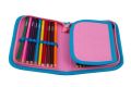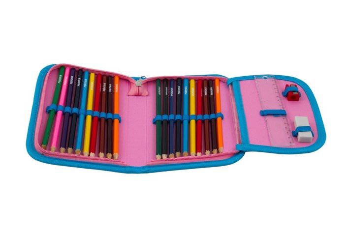 Dětský školní jednopatrový penál s chlopní, který je naplněn pastelkami, fixy, pravítkem, ořezávátkem a gumou.