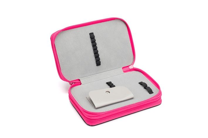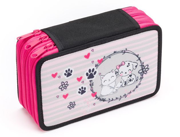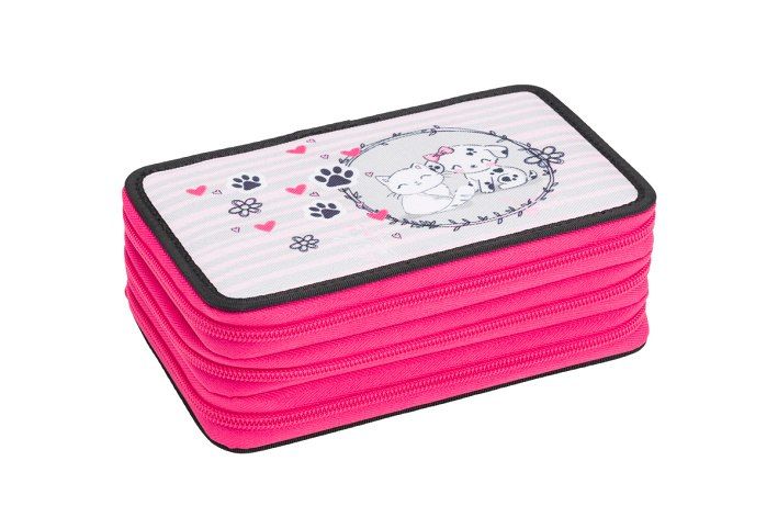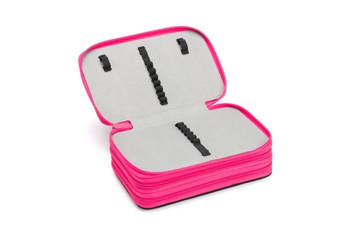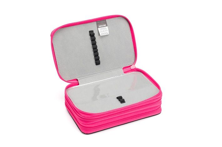Třípatrové penály pojmou nejvíce psacích a školních potřeb. První patro obsahuje 8 gumiček na pastelky, 2 gumičky na tužky a jednu větší na pero, gumičky ořezávátko i gumu a malou uzavíratelnou kapsičku na drobnosti. Ve druhém patře je umístěna průhledná kapsička na rozvrh a 9 pevných gumiček na psací potřeby různých velikostí. Třetí část penálu nabízí navíc ještě dalších 15 gumiček na tužky a 2 malé gumičky na např. bombičky do pera. Školní penál třípatrový, prázdný, o rozměru 190 x 110 x 60 mm. Dokonale barevně sladěný design s aktovkou či batohem je samozřejmostí.