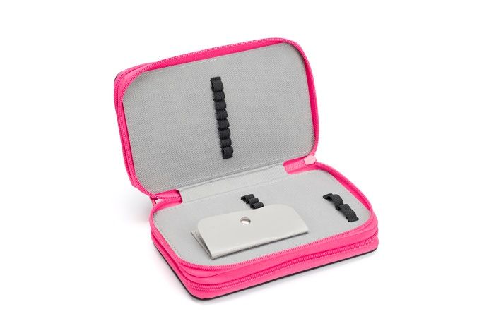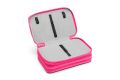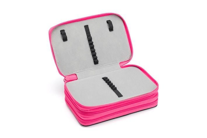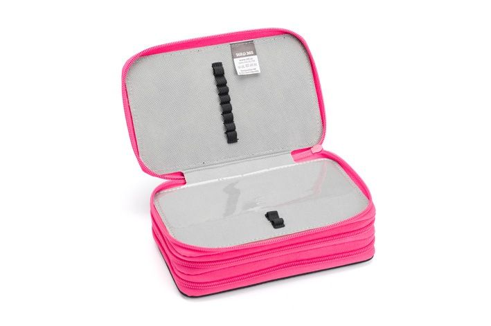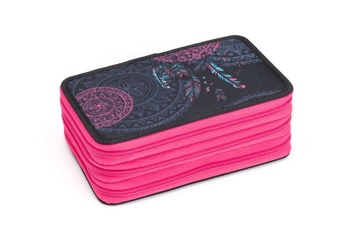 Třípatrové penály pojmou nejvíce psacích a školních potřeb. První patro obsahuje 8 gumiček na pastelky, 2 gumičky na tužky a jednu větší na pero, gumičky ořezávátko i gumu a malou uzavíratelnou kapsičku na drobnosti. Ve druhém patře je umístěna průhledná kapsička na rozvrh a 9 pevných gumiček na psací potřeby různých velikostí. Třetí část penálu nabízí navíc ještě dalších 15 gumiček na tužky a 2 malé gumičky na např. bombičky do pera. Školní penál třípatrový, prázdný, o rozměru 190 x 110 x 60 mm. Dokonale barevně sladěný design s aktovkou či batohem je samozřejmostí.