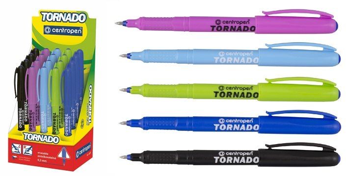 TORNÁDO - ERGO trojúhelníkové držení s masážními body. Při psaní aktivují tzv. prstové hmatové receptory a tím garantují zdravé psaní bez únavy. Vhodné pro leváky, praváky i dysgrafiky. Píše lehce, bez tlačení - doporučeno pro první dětské psaní, jedná se o vhodnou náhradu plnících per. Velmi dlouhá a tenká stopa písma, která se na kvalitním papíře nerozpíjí ani nepropíjí. Zcela nový, zdravotně nezávadný, rychleschnoucí, zmizíkovatelný, sytě modrý inkoust. Cena za 1 kus.