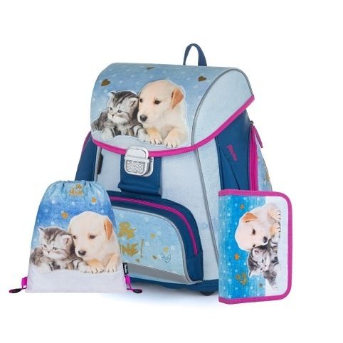 Aktovka: Školní aktovka z řady Premium s motivem mazlíčků je anatomicky tvarovaná a zajišťuje tak správné usazení na zádech. Vyztužená záda a vnitřní výztuha udržují stálý tvar batohu. Polstrování je z příjemného prodyšného materiálu, široké měkčené popruhy jsou navrženy tak, aby dokonale přilnuly a rovnoměrně zatížily ramena dítěte. Aktovka se skládá z jedné prostorné komory, kam se pohodlně vejdou všechny školní pomůcky pro děti v 1. a ve 2. třídě. Dno batohu je z pevného materiálu, chrání tím obsah před převržením a vysypáním. Zapínání je na bezpečnostní přezku. Přední kapsička je určena na svačinu, nechybí řada reflexních prvků, díky kterým je aktovka viditelnější.