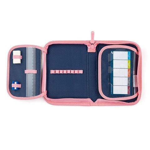 Penál: Jednopatrový školní penál se dvěma chlopněmi bez náplně. Gumová poutka k uchycení psacích potřeb. Na vnitřní chlopni je průhledná fólie pro rozvrh hodin.