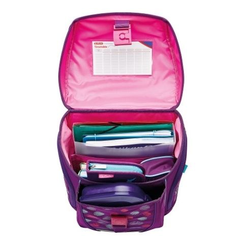 38 x 32 x 22 cm, ergonomicky tvarovaná a polstrovaná záda, duálně nastavitelné ramenní popruhy, nastavitelný hrudní pás, reflexní materiál Oralite, Magnetický zámek Fidlock, 2 odnímatelné aplikace se suchým zipem. Výbava: penál 16 dílů, sáček na cvičky, trojúhelníkové pouzdro na pastelky
