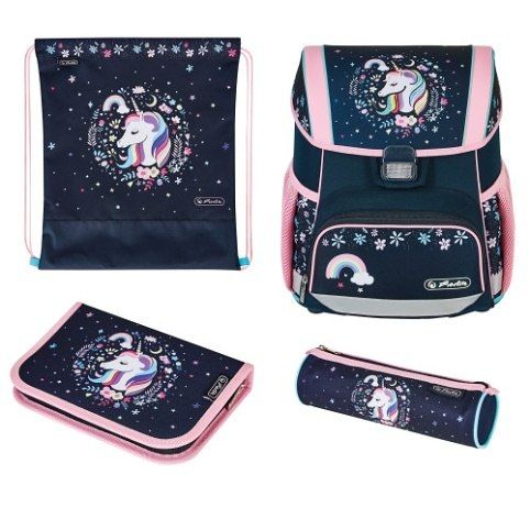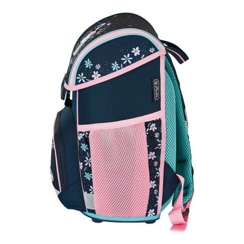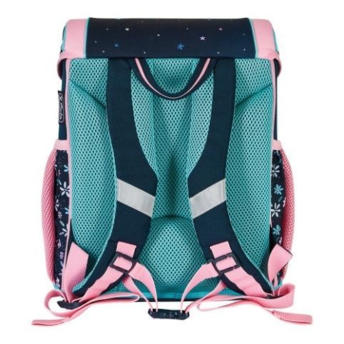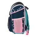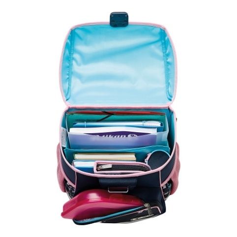 37x31x22cm, ergonomicky tvarované a prodyšné polstrování zad, nastavitelné ramenní popruhy, výškově nastavitelný hrudní pás, hlavní kapsa s prostorem pro knihy, boční kapsy s elastickými pásky, přední kapsa na zip, stabilní spodní deska, pohodlná rukojeť, zavírání Click lock, reflexní materiály Oralite, integrovaná odrazka v zámku. Hmotnost 950 g, objem 15 l. Výbava: penál 16 dílů, sáček na cvičky, kulaté pouzdro