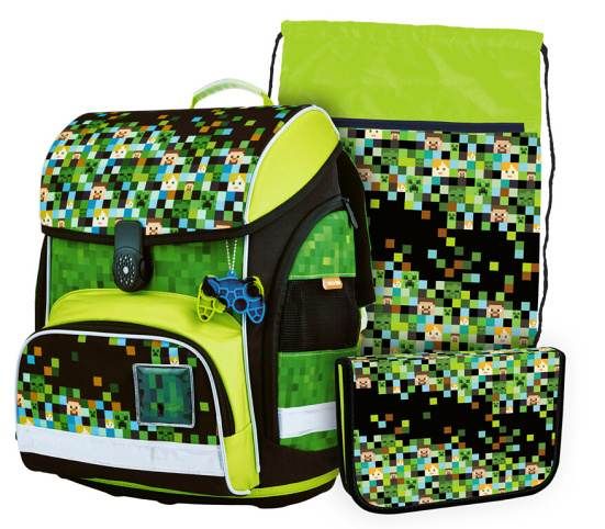 Školní set obsahuje: Školní aktovka - kvalitní, ergonomicky tvarovaná odlehčená školní aktovka je vybavena reflexními prvky a anatomicky tvarovanými zády s pevnou konstrukcí. 2. Školní penál jednopatrový, prázdný s dvěma chlopněmi, o rozměru š. 19,5 x v. 3 x h. 13,5 cm 3. Školní sáček na tělocvik vyrobený z pevného, kvalitního materiálu. Rozměr sáčku 44 x 32 cm.
