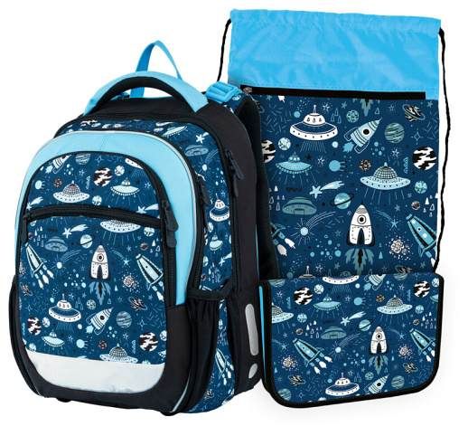 Školní set obsahuje: 1. Školní batoh junior - kvalitní, ergonomicky tvarovaný odlehčený školní batoh je vybaven reflexními prvky a anatomicky tvarovanými zády s pevnou konstrukcí. 2. Školní penál jednopatrový, prázdný s dvěma chlopněmi, o rozměru š. 19,5 x v. 3,5 x h. 13 cm. 3. Školní sáček na cvičky vhodný pro žáky 1. stupně ZŠ vyroben z pevného, kvalitního materiálu. Rozměr sáčku na přezůvky 44 x 32 mm. Školní batoh VHODNÝ PRO 1 - 4. třídu. Kvalitní, ergonomicky tvarovaný odlehčený školní batoh je vybaven reflexními prvky a anatomicky tvarovanými zády s pevnou konstrukcí. Školní batohy Stil jsou ověřeny odborníky. Parametry školního batohu: Rozměr: výška 40 cm, šířka 30 cm, hloubka 20 cm. Hmotnost: 0,9 kg. Nosnost: 7 kg. Objem: 20 l. Vlastnosti školního batohu: STIL ADJUSTABLE SYSTÉM: nastavitelný systém zad se třemii stupněmi pro optimální usazení batohu na zádech podle výšky a věku dítěte. Batoh, který roste s dítětem. 3D ZÁDOVÝ SYSTÉM: batoh perfektně sedí na zádech. Anatomický zádový panel se přizpůsobí páteři dítěte a systém Air Flow a prodyšné polstrování umožní cirkulaci vzduchu a příjemné nošení. Hrudní pás s kvalitní přezkou zajistí dobré usazení aktovky na zádech dítěte. BEZPEČNOST: bezpečnostní prvky jsou velmi důležité, proto je aktovka vybavena reflexními pásky na všech stranách batohu, které zaručí lepší viditelnost a bezpečnost dítěte ve tmě. VNITŘNÍ USPOŘÁDÁNÍ: Skládá se ze 3 prostorných komor opatřených pevnými zipy a přední kapsy pro uložení drobných předmětů. Pevná kontrukce a voděodolné dno s plastovými nožičkami. AIR FLOW: prodyšné pohodlně tvarované polstrování zadního panelu. Anatomicky tvarované nastavitelné popruhy pro pohodlné nošení. Hrudní pás pro lepší rozložení váhy školního batohu na zádech.