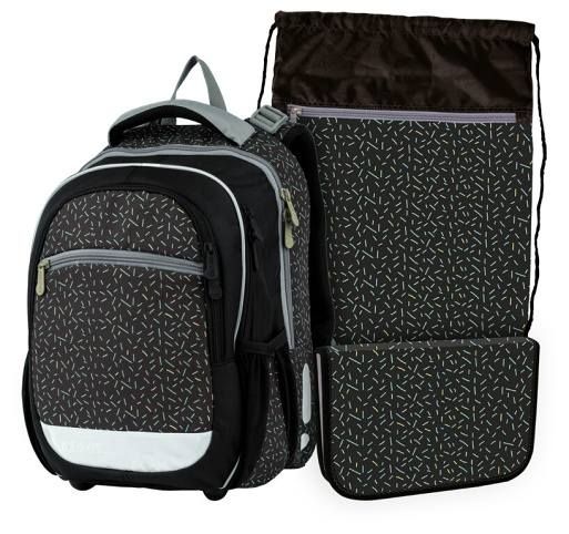 Školní set obsahuje: 1. Školní batoh junior - kvalitní, ergonomicky tvarovaný odlehčený školní batoh je vybaven reflexními prvky a anatomicky tvarovanými zády s pevnou konstrukcí. 2. Školní penál jednopatrový, prázdný s dvěma chlopněmi, o rozměru š. 19,5 x v. 3,5 x h. 13 cm. 3. Školní sáček na cvičky vhodný pro žáky 1. stupně ZŠ vyroben z pevného, kvalitního materiálu. Rozměr sáčku na přezůvky 44 x 32 mm. Školní batoh VHODNÝ PRO 1 - 4. třídu. Kvalitní, ergonomicky tvarovaný odlehčený školní batoh je vybaven reflexními prvky a anatomicky tvarovanými zády s pevnou konstrukcí. Školní batohy Stil jsou ověřeny odborníky. Parametry školního batohu: Rozměr: výška 40 cm, šířka 30 cm, hloubka 20 cm. Hmotnost: 0,9 kg. Nosnost: 7 kg. Objem: 20 l. Vlastnosti školního batohu: STIL ADJUSTABLE SYSTÉM: nastavitelný systém zad se třemii stupněmi pro optimální usazení batohu na zádech podle výšky a věku dítěte. Batoh, který roste s dítětem. 3D ZÁDOVÝ SYSTÉM: batoh perfektně sedí na zádech. Anatomický zádový panel se přizpůsobí páteři dítěte a systém Air Flow a prodyšné polstrování umožní cirkulaci vzduchu a příjemné nošení. Hrudní pás s kvalitní přezkou zajistí dobré usazení aktovky na zádech dítěte. BEZPEČNOST: bezpečnostní prvky jsou velmi důležité, proto je aktovka vybavena reflexními pásky na všech stranách batohu, které zaručí lepší viditelnost a bezpečnost dítěte ve tmě. VNITŘNÍ USPOŘÁDÁNÍ: Skládá se ze 3 prostorných komor opatřených pevnými zipy a přední kapsy pro uložení drobných předmětů. Pevná kontrukce a voděodolné dno s plastovými nožičkami. AIR FLOW: prodyšné pohodlně tvarované polstrování zadního panelu. Anatomicky tvarované nastavitelné popruhy pro pohodlné nošení. Hrudní pás pro lepší rozložení váhy školního batohu na zádech.