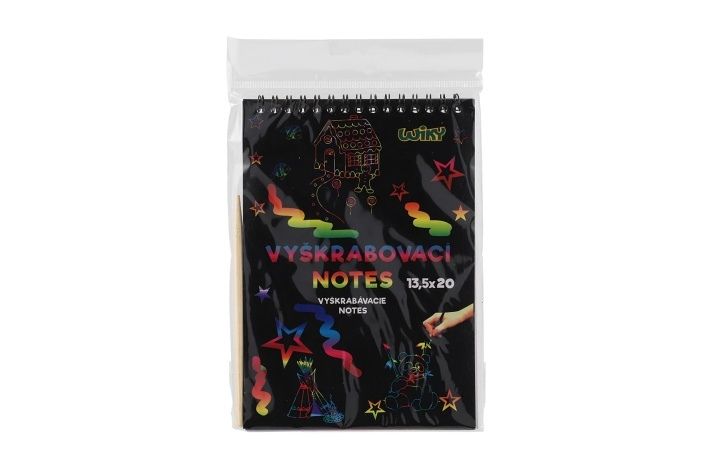 Kreativně se vydovádějte na vyškrabovacím notesu, který má rozměry 13,5x20 cm. Na jednotlivých listech, můžete pomocí vyškrabovacího pera vytvářet různé pestrobarevné obrázky.
