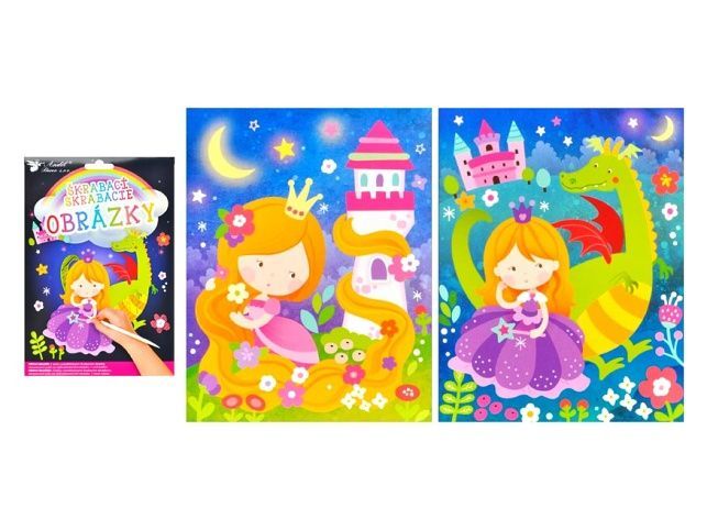 Škrabací obrázek na barevném podkladě - Princezna - Udělejte si pohodové kreativní odpoledne s dětmi a vyškrabejte si obrázek, který si pak děti mohou zarámovat ve svém pokojíčku. Vyškrabávání zvládnou i ty nejmenší děti. BALENÍ OBSAHUJE: - 2 předlohy s předtištěnými škrabacími obrázky - rydlo - šablony NÁVOD K POUŽITÍ: Pomocí škrabacího pera seškrabejte vyznačenou plochu a vystoupí na Vás nádherný obrázek. VAROVÁNÍ: Nevhodné pro děti do 3 let, nebezpečí poranění ostrým hrotem! Doporučená věková kategorie od 5 let. Uvedená cena je za 1 balení.