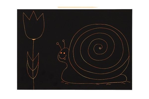Po seškrábání linek předtištěného obrázku se objeví krásný rytinový obrázek. Sada obsahuje obrázek natištěný na černém kartonu, 1x prázdný arch, na který lze vyškrábat libovolné ornamenty a dřevěné pero.