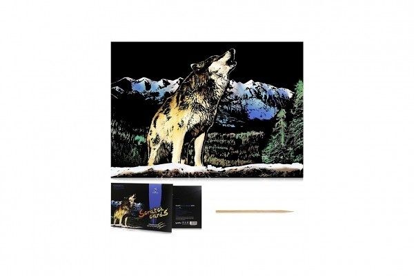 Po seškrábání linek předtištěného obrázku se objeví krásný rytinový obrázek. Sada obsahuje obrázek natištěný na černém kartonu, 1x arch, na kterém se po seškrábání šedých linek zobrazí krásný barevný obrázek vlka.