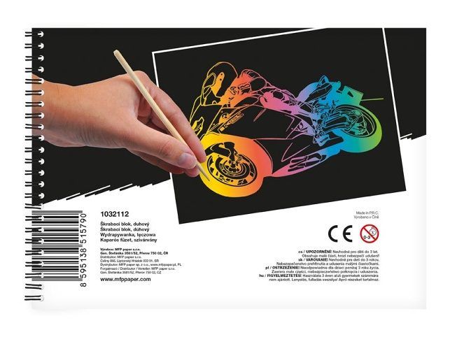 Vyškrabovací notes s perem - Dopřejte si chvilku odpočinku a kreativně se vydovádějte na vyškrabovacím notesu. Na jednotlivých listech můžete pomocí vyškrabovacího pera vytvářet různé pestrobarevné obrázky. Dítě si zlepší motoriku ruky a naučí se kreslit. NOTES OBSAHUJE: - 10 listů - 1 škrabátko VAROVÁNÍ: Nevhodné pro děti do 3 let. Obsah malých částí - hrozí nebezpečí udušení Uvedená cena je za 1 balení.