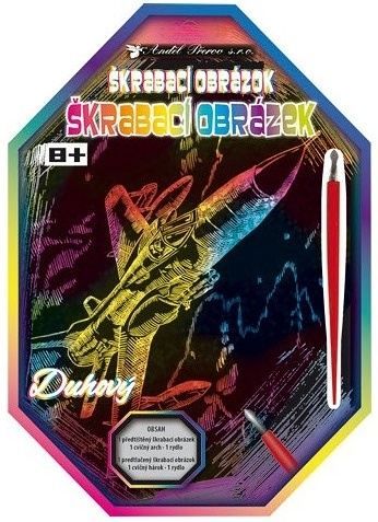 Vyškrabávací obrázek s duhovým podkladem 30x21,5cm Balení obsahuje předtištěný obrázek 30x21,5cm a rydlo. NÁVOD: Odstraňte krycí fólii. Přiloženým rydlem seškrábejte předtištěný obrázek.