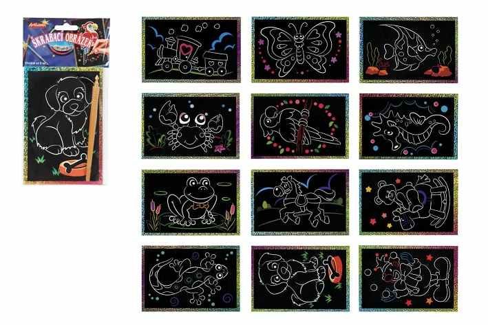 Vhodné pro malé děti- neškrabou se linky ale celý obrázek- podobně jako stírací los. Vznikne krásný barevný obrázek, který se pěkně leskne. Vhodné od 3 let. Velikost obrázku 15 x 10 cm.