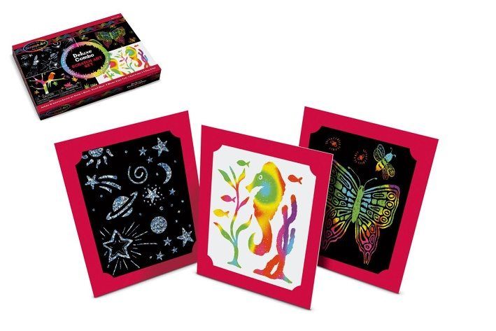 Parádní vyškrabovací sada! Tato sada obsahuje materiál pro 16 různých barevných podkladů pro vytvoření uměleckých výtvorů dětí. Je možné vyškrabávat podle vlastní fantazie nebo podle šablon v sadě.