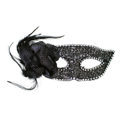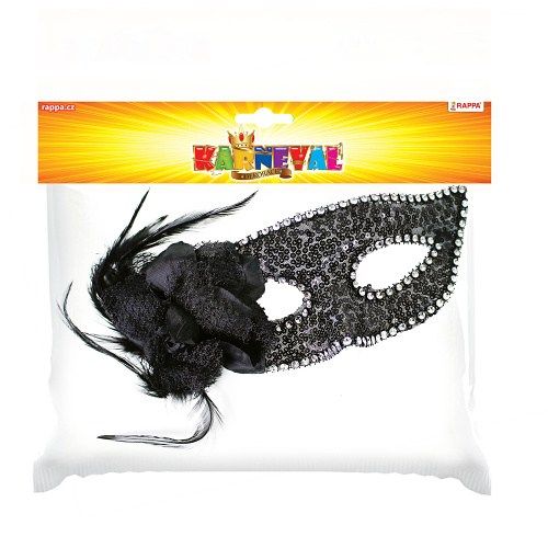 Černá elegantní škraboška na gumičku je pokryta jemnou krajkou a lemována bílými zářivými kamínky. Na pravé straně je navíc zdobena černým květem a peřím.