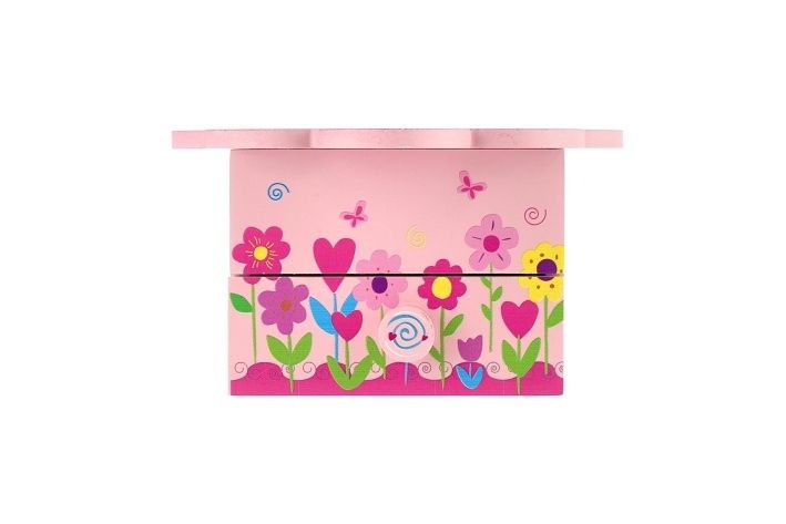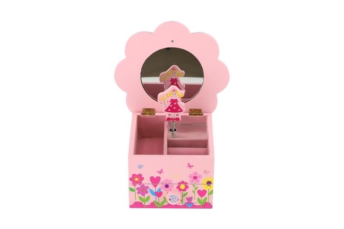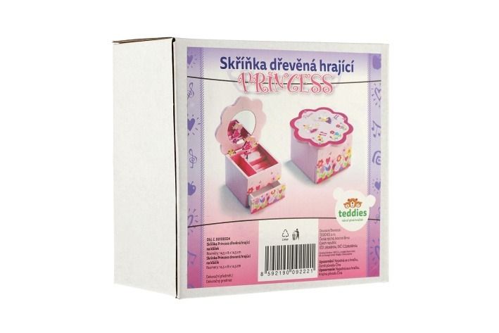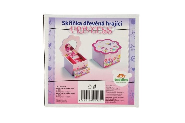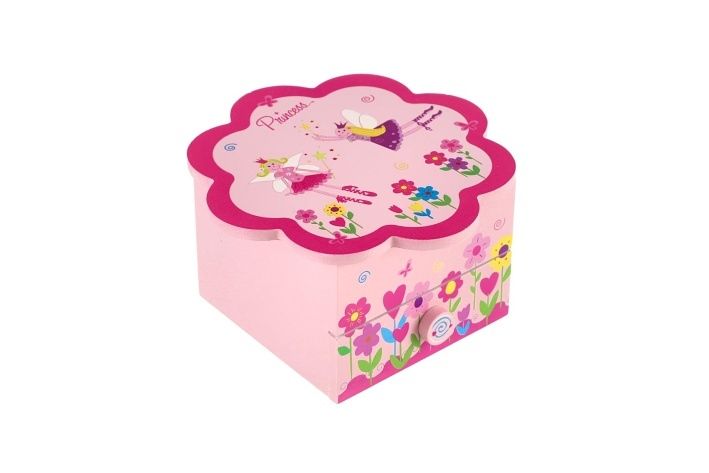 Hračky ze dřeva patří mezi zdravotně nezávadné. Dřevěné hračky jsou oblíbené nejen dětmi, ale i rodiči. Tato dřevěná hračka vždy potěší. Skříňka hrající Princess květina má 1 vysouvací šuplíček, nahoře přihrádku na prstýnky a malé zrcátko. Když skříňku otevřete, překvapí vás malá víla, která se točí a hraje melodii. Strojek je pouze natahovací, nevyžaduje baterie. Velikost skříňky je 10 x 10 x 9 cm. Cena je uvedena za 1 kus hračky.