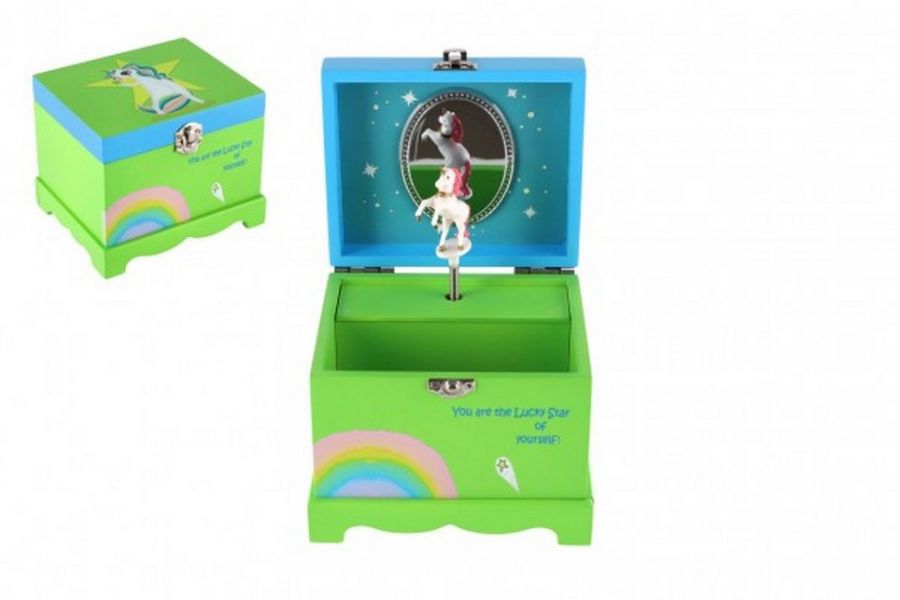 Tato hrací šperkovnice bude ideálním místem pro uložení pokladů každé dívky. Šperkovnice je vyrobena ze dřeva, má krásnou zelenou barvu a je zdobena hvězdou a motivem jednorožce, což z ní dělá ideální doplněk pro dětský pokoj. Pod krytem se zrcadlem je prostor pro pořádání suvenýrů nebo šperků. Také zde je bílo-růžový jednorožec, který se po natažení klíčku točí a hraje. Rozměr šperkovnice: 12,5x12,5x10cm. Výrobek není hračka