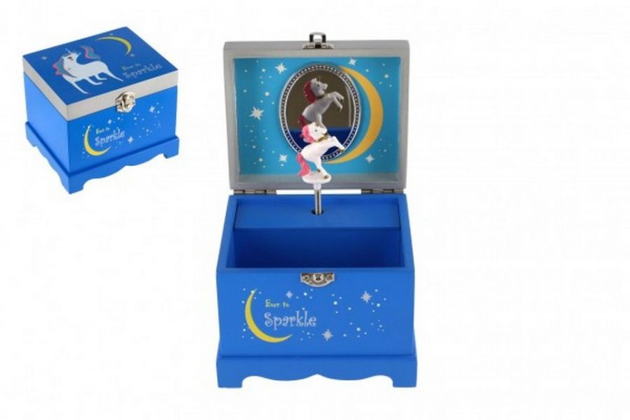 Tato hrací šperkovnice bude ideálním místem pro uložení pokladů každé dívky. Šperkovnice je vyrobena ze dřeva, má krásnou modrou barvu a je zdobena hvězdami a motivem jednorožce, což z ní dělá ideální doplněk pro dětský pokoj. Pod krytem se zrcadlem je prostor pro pořádání suvenýrů nebo šperků. Také zde je bílo-růžový jednorožec, který se po natažení klíčku točí a hraje. Rozměr šperkovnice: 12,5x12,5x10cm. Výrobek není hračka