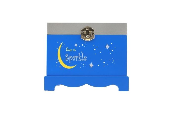 Tato hrací šperkovnice bude ideálním místem pro uložení pokladů každé dívky. Šperkovnice je vyrobena ze dřeva, má krásnou modrou barvu a je zdobena hvězdami a motivem jednorožce, což z ní dělá ideální doplněk pro dětský pokoj. Pod krytem se zrcadlem je prostor pro pořádání suvenýrů nebo šperků. Také zde je bílo-růžový jednorožec, který se po natažení klíčku točí a hraje.