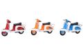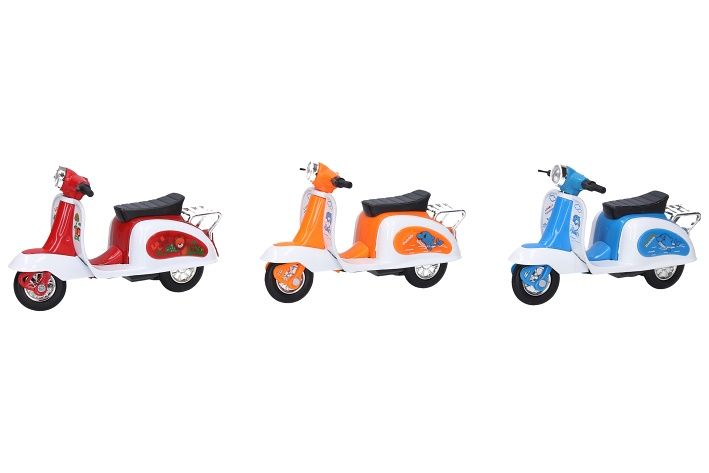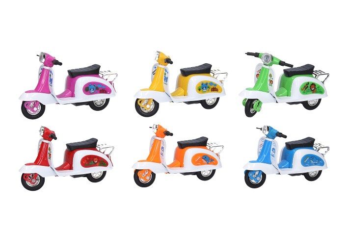 Skútr volná kola 12 cm. Rozměry 12x5x7 cm. Display box 6 ks. 6 variant - modrá, zelená, žlutá, červená, oranžová, růžová.