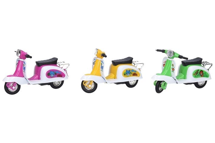 Skútr volná kola 12 cm. Rozměry 12x5x7 cm. Display box 6 ks. 6 variant - modrá, zelená, žlutá, červená, oranžová, růžová.