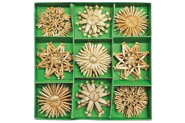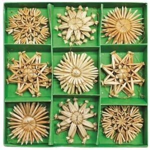 Slaměné ozdoby v krabičce cca 6 cm, 26 ks