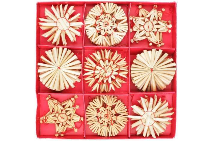 Slaměné ozdoby v krabičce cca 6 cm, 32 ks
