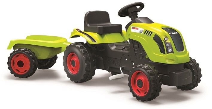 Šlapací traktor CLAAS s volantem a přívěsným vozíkem, který lze odpojit. Odklápěcí kryt motoru. Nastavitelné sedadlo dle výšky dítěte. Klakson na volantu. Vyrobeno z velmi kvalitního plastu. Rozměry vč. vozíku: 142 x 54,5 x 44 cm. Délka traktoru bez vozíku cca 80 cm. Hmotnost 6,3 kg.