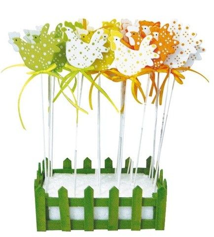 Zápich dřevěná slepičky s puntíky 5cm + špejle. Dodáváme v mixu motivů, cena za 1 kus. Při koupi 24 ks dřevěná ohrádka zdarma.