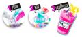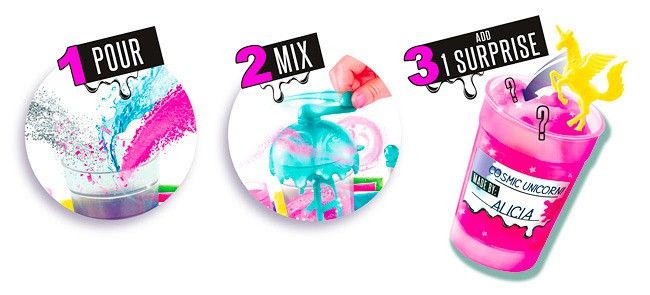 Vyrobte si svůj vlastní sliz. Nasypejte do kelímku prášek, přidejte glitry a figurku. Nalijte vodu až po rysku, zavřete kelímek a směs pořádně protřepejte. Pak kelímek otevřete a počkejte pět minut. Sliz je hotový. Kombinujte barvy, přidejte třpytky a užijte si tu pravou zábavu se slizem.
