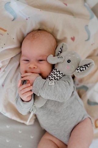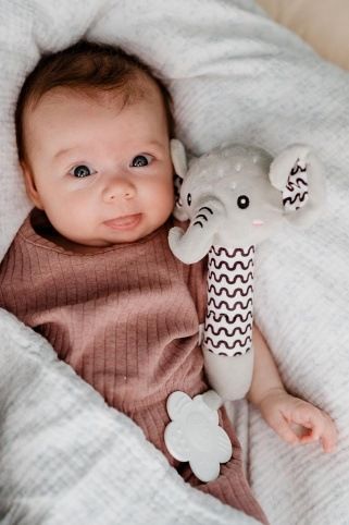 Roztomilý plyšový sloník je ideální první hračka pro miminka již od narození. Měkké tělo sloníka se lehce drží v malých ručičkách a při stisku vydává jemný pískací zvuk, který podporuje sluchový rozvoj a přirozeně upoutává pozornost miminka.