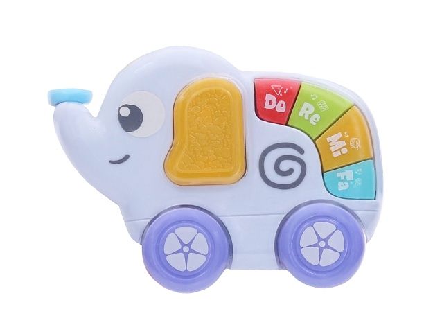 Slon s piánkem. Rozměry 11,2x3,8x8,6 cm. Světelné a zvukové efekty. 2xAAA baterie nejsou součástí.
