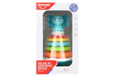 Sloup s kroužky a slonem na baterie. Po vložení jednotlivých kroužku hračka vydává zvuky a hraje melodie. Napájení na 2 AAA baterie (nejsou součástí). Rozměry cca 14 x 14 x 22,2 cm. Rozměry balení cca 16 x 27 x 16 cm. Věk 6m+